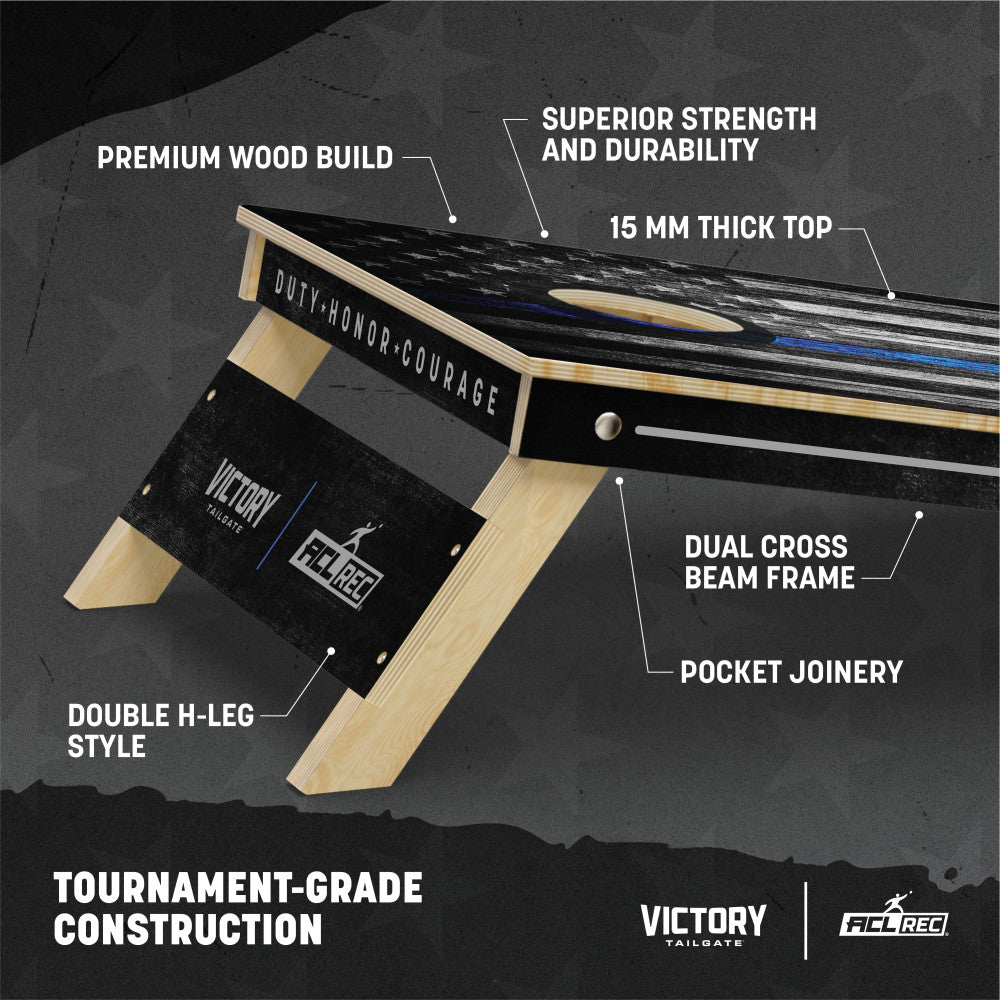 Bring tournament-level gameplay to your backyard with the Victory Tailgate 2x4 Tournament Thin Blue Line Cornhole Set. Crafted from solid basswood with a 15mm thick top, this regulation-size set features a double H-style folding leg design, pocket joinery, and dual cross-beam construction for unmatched stability and no-bounce performance. The clear coat finish delivers smooth slide action and long-lasting protection, making it ideal for repeated use in any setting. Complete with eight 6" x 6", 16 oz all-weather poly-canvas bags filled with dust-free resin, this set is built for consistent throws, mess-free handling, and easy clean-up after every match.